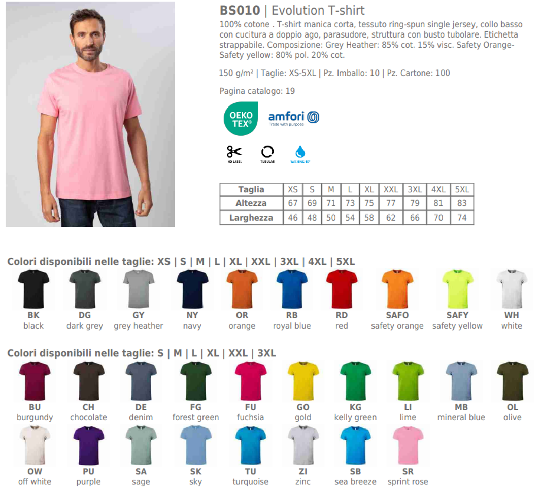 100% cotone. T-shirt manica corta set-in, scollo profondo a V in costina, leggermente sfiancata, nastro di rinforzo alle spalle, struttura con cuciture laterali. Col. 94: 97% cot. 3% pol. Col. HD: 50% cot. 50% pol. (Col. 30: 160 g/m²).
